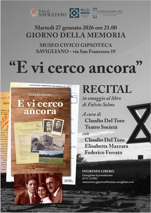 Martedì 27 Gennaio alle ore 21:00, in occasione del Giorno della Memoria, al MuGi uno spettacolo inedito in omaggio al libro "E vi cerco ancora" di Fulvio Solms, già giornalista del “Corriere dello Sport”, che ha ricostruito le vicende relative alla tragedia della deportazione dei suoi nonni.