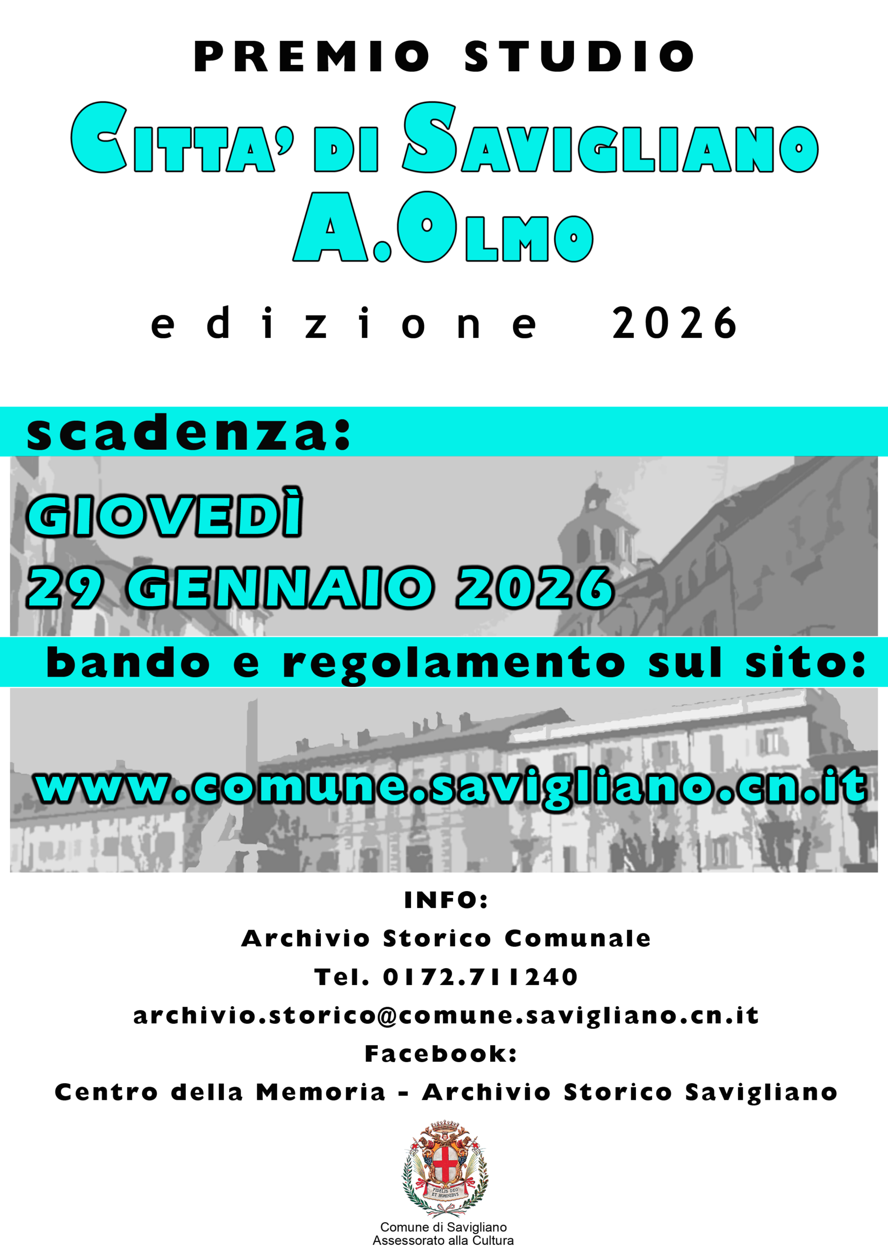 «Dare un riconoscimento a coloro che abbiano prodotto elaborati ed opere culturali riguardanti il territorio saviglianese». Con lo stesso obiettivo di sempre, il premio di studio “Città di Savigliano – Antonino Olmo” è stato bandito anche per quanto riguarda l'edizione 2026.